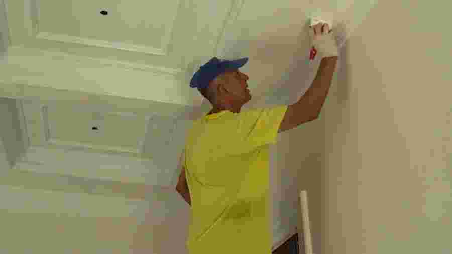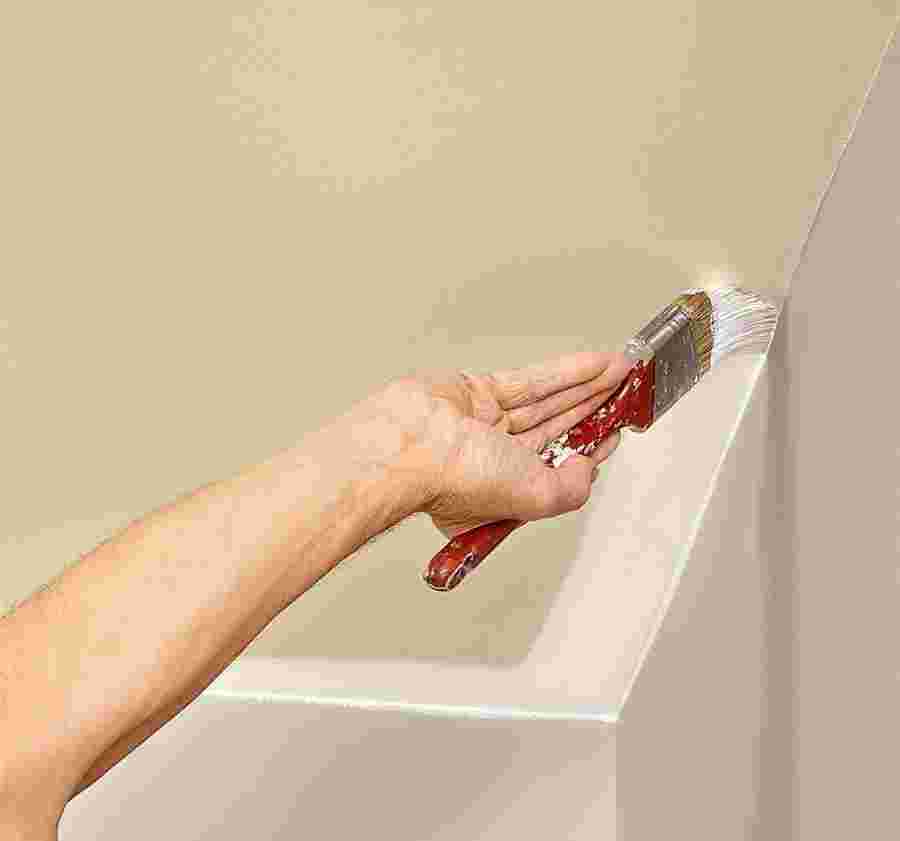 Работа начинается с проблемных зон – углов и мест соединений со стеной. Задача — качественно прокрасить поверхность. Валиком этого сделать не получится, поэтому придётся действовать кистью. Достаточно нанести краску на всю ширину инструмента (6–7 см), причём сразу несколько слоёв делать не надо, иначе будет видна разница между основным покрытием валиком или пульверизатором.