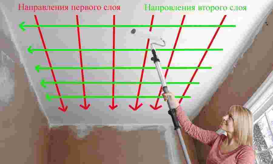 При использовании валика слои наносят перпендикулярно предыдущему: это позволит не пропустить неокрашенные участки. Заключительный производится от окна к противоположной стене, чтобы незначительные огрехи (полосы, непрокрашенные места) были незаметны при ярком свете. Если окон в помещении несколько, ориентируются на большее по размеру.