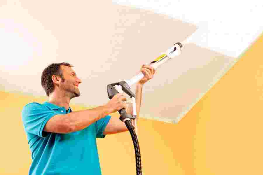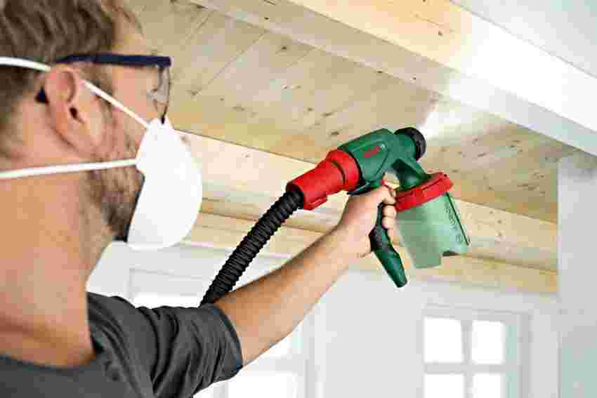 Хорошо себя зарекомендовало для внутренней отделки потолков и стен использование пульверизаторов. Они очень просты в применении. Перед началом работ нужно на 3/4 заполнить ёмкость устройства однородным раствором, а затем нажать на кнопку и удерживать распылитель на неизменном расстоянии от окрашиваемой поверхности.