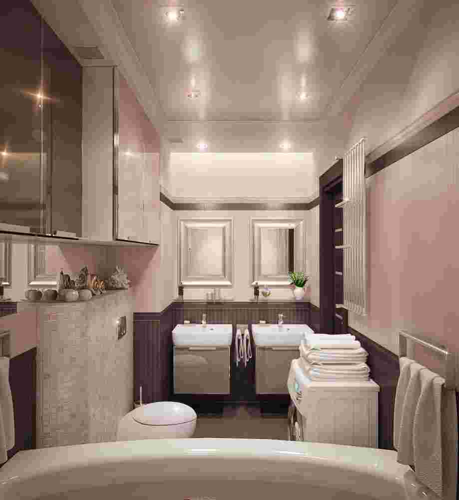 - Многоуровневые потолки более актуальны для больших помещений с высокими потолками. Кроме того, их активно используют при необходимости скрытой прокладки коммуникаций. Впрочем, даже в ванной комнате такое решение будет уместным – например, можно снизить потолок над ванной и смонтировать на нем уютное освещение.