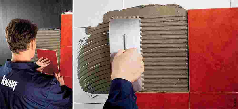 Укладка настенной плитки с помощью раствора, приготовленного на основе сухой строительной смеси. Слой клея, нанесенный на поверхность стены «гребенкой», позволяет выравнивать плитки в геометрически безупречной плоскости