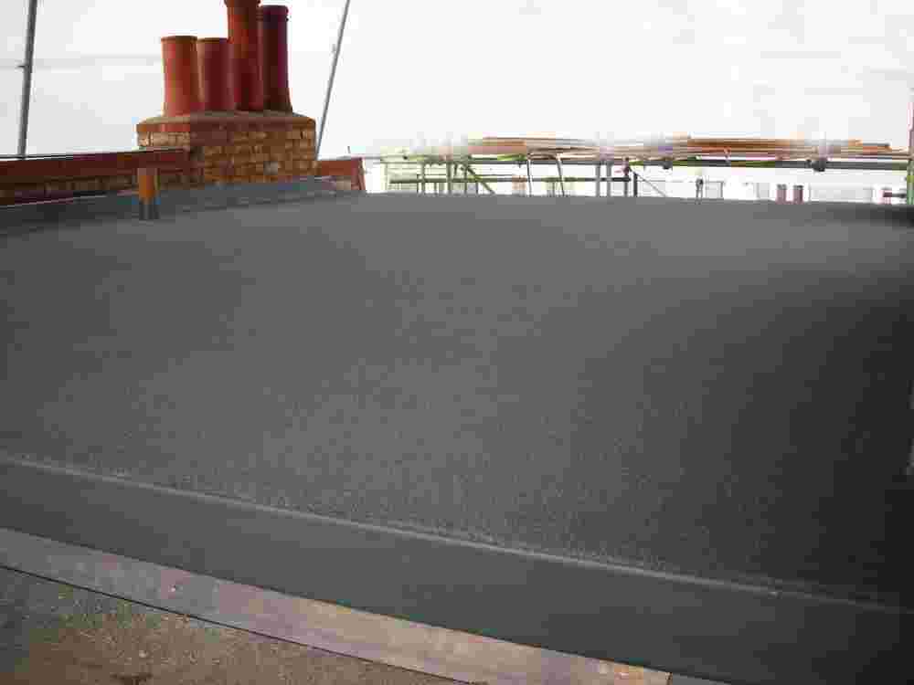 - Стяжка. После того, как основание более-менее выровнено можно приступать к заливке бетонной стяжки. Кстати, на этом этапе создается разуклонка, которая является неотъемлемой частью любой плоской крыши. Она нужна для естественного удаления атмосферных осадков. Как правило, уклон создается в противоположную сторону от входа в здание, дабы не портить его внешний вид.
