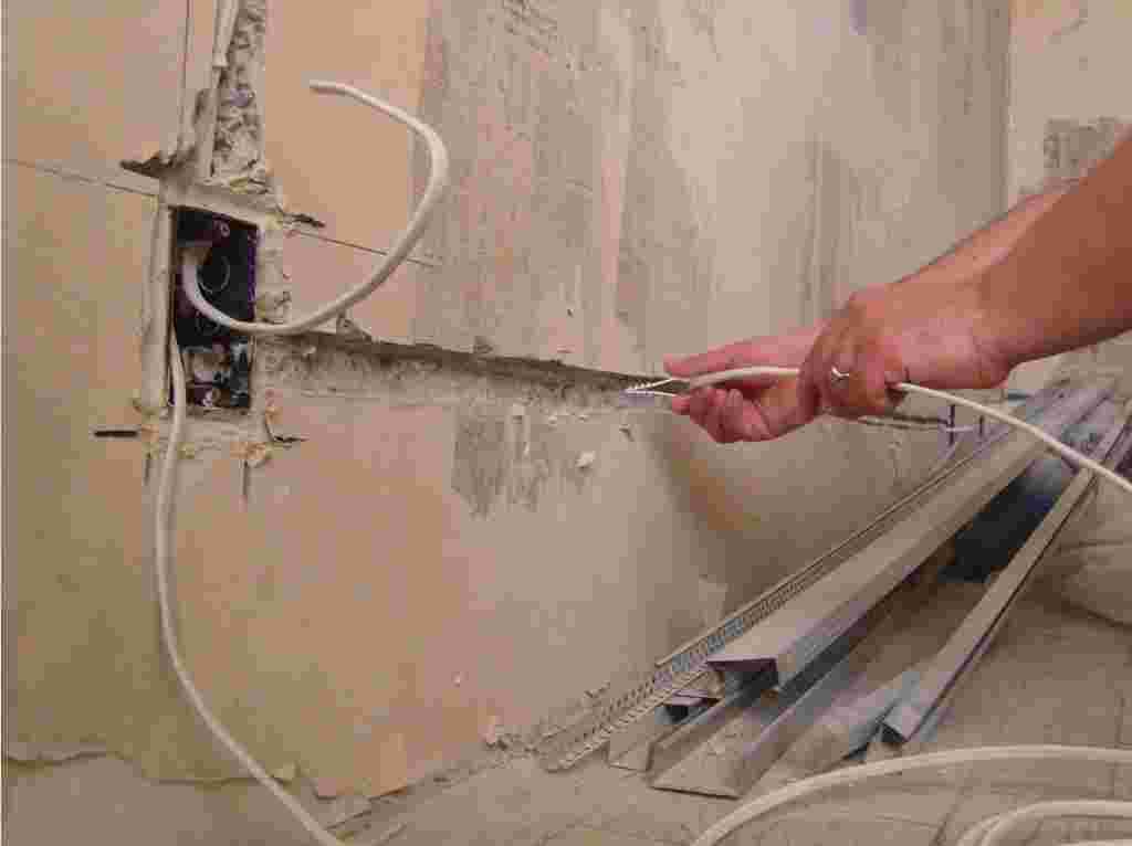 Меняется электрика. Старая проводка уже убрана, штробятся каналы для новой. После чего укладывается кабель, а каналы замазываются гипсом.