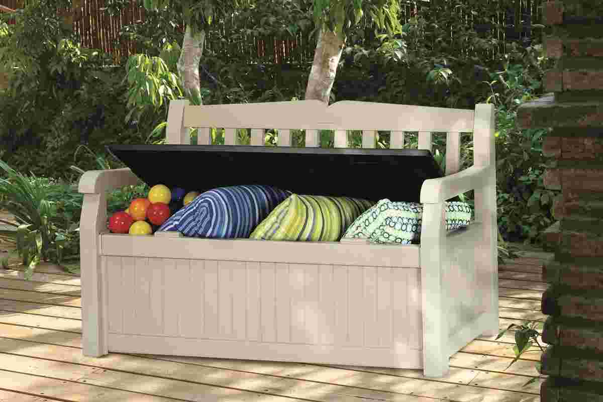 «Eden Garden Bench» изготовлена из прочного пластика, который имитирует натуральную древесину. Внешний вид не портится под воздействием солнечных лучей и от влаги. Такой диван-сундук не требует особого ухода, имеет простую сборку, а благодаря небольшому весу его легко перемещать по садовому участку.