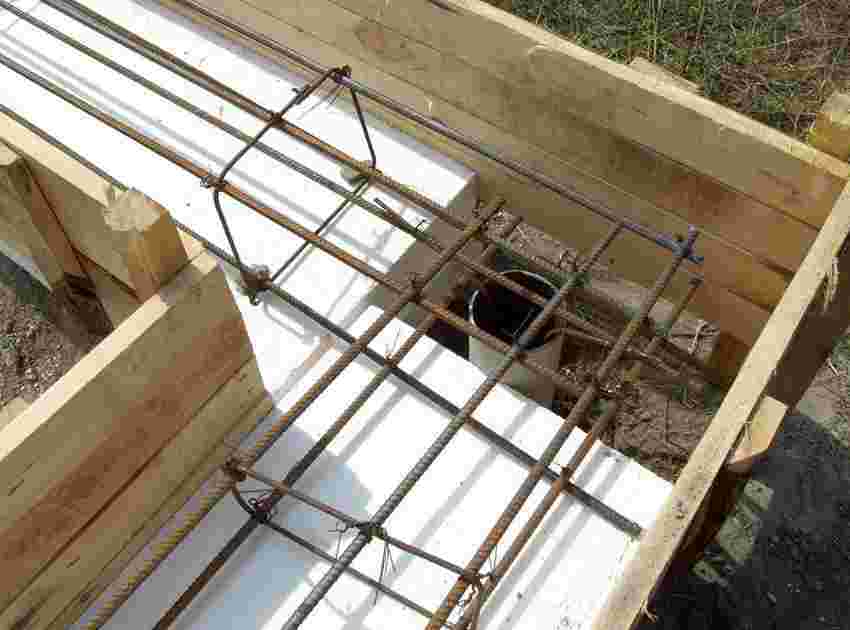 Такие основания более прочные и устойчивые, чем обычные конструкции, в них используется армирование горизонтальных и вертикальных поясов. Но устройство рындбалки (перевязки) значительно повышает стоимость и усложняет фундамент. Поскольку требует единого армирования (перевязки арматуры) как в балке, так и в столбике. Рындбалку располагают либо по поверхности грунта, либо с небольшим заглублением, устроив под ней песчаную подушку.