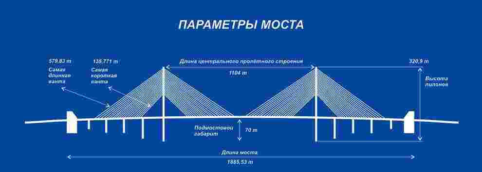 Рассмотрим на примере Русского моста. Его схема: 60+72+3×84+1104+3×84+72+60 м. Эта запись означает, что длина первого пролета составляет 60 метров, второго — 72 метра, три следующих пролета по 84 метра каждый. 1104 м — длина центрального пролета, которая сделала Русский мост мировым рекордсменом. Затем значения идут в обратной последовательности: три пролета по 84 метра, предпоследний пролет 72 и последний 60 метров.