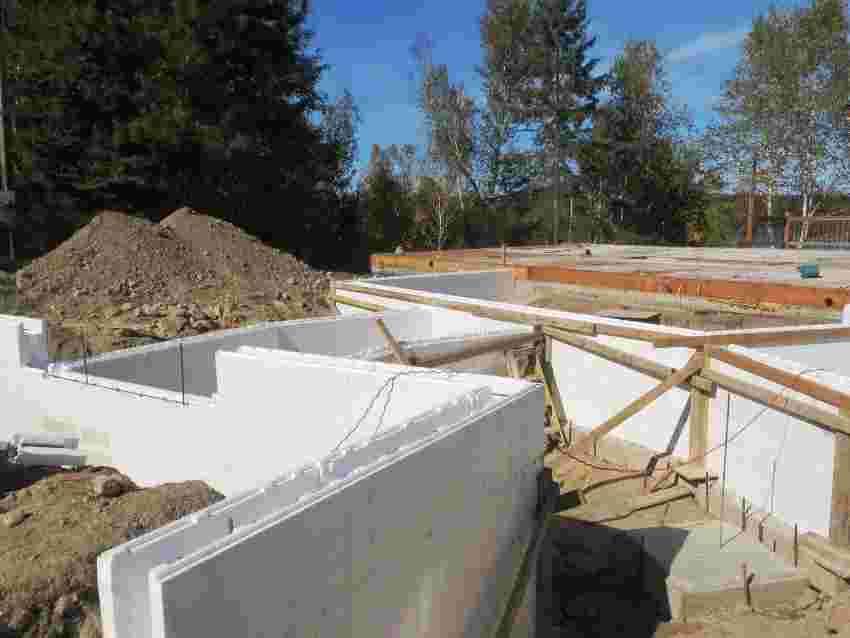 Стены, изготовленные с помощью такого метода, рекомендуется устанавливать на ленточный фундамент. Данная основа лучше всего подходит для строительства с использованием несъемных пенопластовых форм