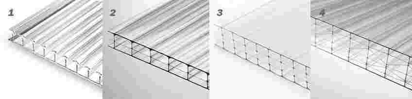 Перегородки внутри поликарбоната образуют соты. Показатели плотности и несущей способности определяются структурой материала и конфигурацией сот поликарбоната: