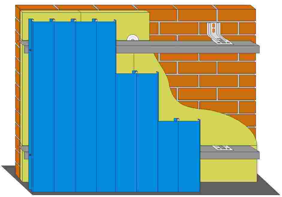- Затем к торчащим кронштейнам (ЕС-скоба) крепят оцинкованный профиль, а к нему – сайдинг.