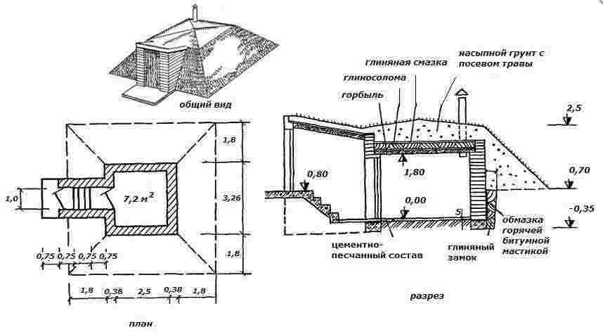 - Полузаглублённый погреб. Частично размещён ниже уровня земли. Углубляется на 0,7-1 м. Сооружается при высоком залегании УГВ. Требует дополнительной гидроизоляции, часто оборудуют глиняный замок.