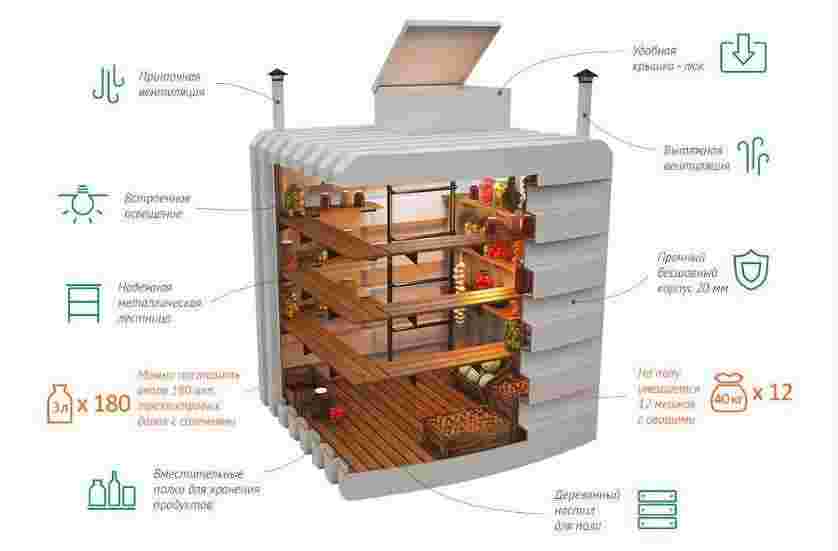 Светодиодное автономное освещение, деревянный пол, обработанный антисептиком. Деревянные полки, обработанные антисептиком, шириной 300 мм, расположены по периметру погреба в 3 уровня (кроме модели 1500, где полки устанавливаются в 2 уровня).