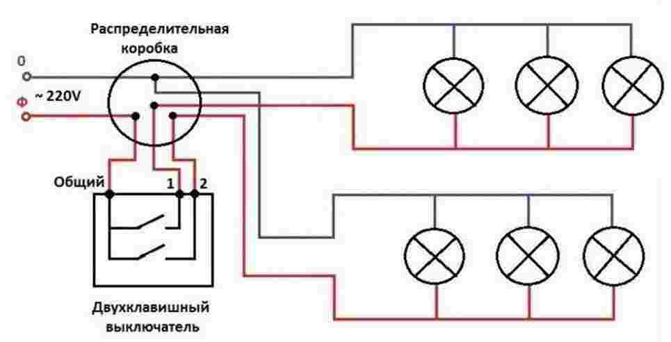 - Если используется двухклавишный выключатель, то схема усложняется за счет большего количества проводов и подключения двух независимых контуров. При этом принцип работы остается тем же.