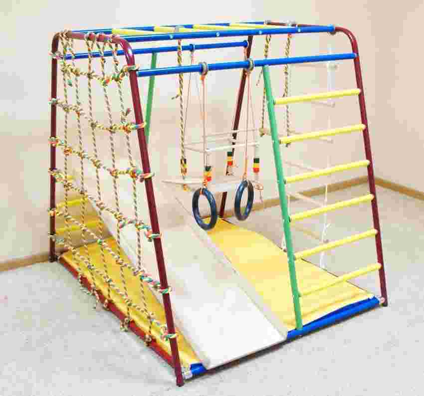 - Комплектация дополнительным снаряжением должна выполняться в зависимости от интересов ребёнка. А также от этого может зависеть и выбор материала изготовления конструкции. Например, для силовых упражнений лучше выбрать металл.