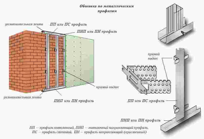 - Их надежно закрепляют на стенах, для этого используют П-образные кронштейны. Если высота стены больше, чем лист гипсокартона, требуется установить горизонтальные перемычки (отрезки порезанного профиля).