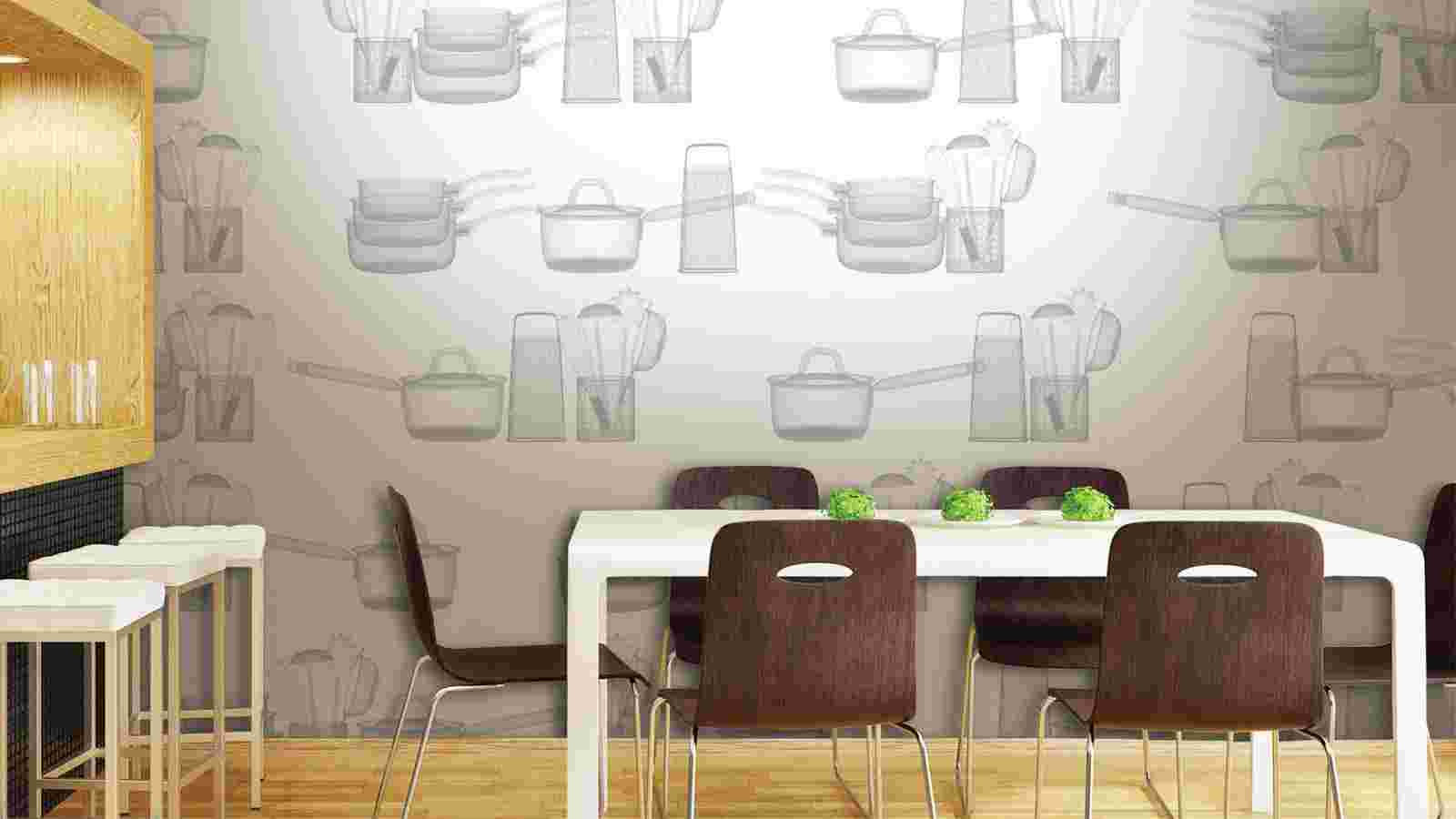 Самым бюджетным вариантом является оклейка стен обоями, практичнее всего это сделать стеклообоями под покраску или виниловыми. Последние в силу своей толщины скроют неровности на стенах, а с их гладкой водоотталкивающей поверхности отлично удаляются все виды загрязнений, в том числе и жир.