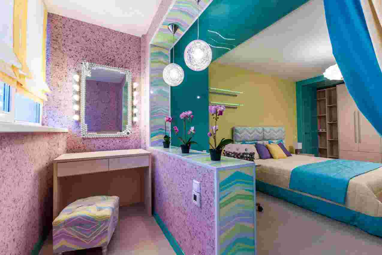Творческие личности могут комбинировать жидкие обои ярких оттенков в стиле лоскутного сочетания, но такая процедура требует высокой аккуратности, поскольку нанесенные слои обоев должны соответствовать друг другу, а границы между оттенками необходимо сделать идеально ровными и пропорциональными.