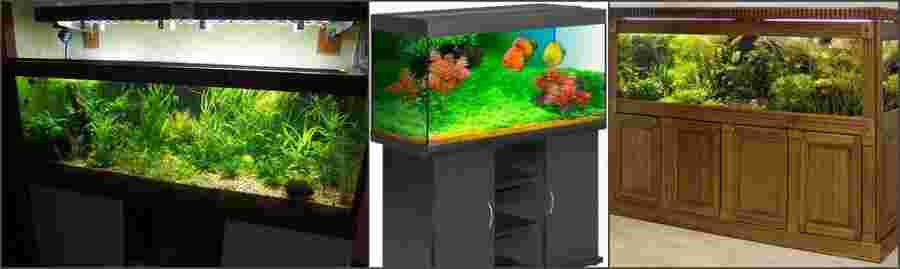 Некоторые стеклянные изделия реализуются в комплекте с тумбой-подставкой. Ее удобно применять для хранения кормов, сачков, помп и прочих принадлежностей. Также в продаже можно встретить устройства с металлическими ножками, которые крепятся на перекладины. Они имеют разную высоту и длину (обычно не более 1,5 метров). Конструкция должна быть очень надежной, ведь масса воды в ней порой превышает 400–500 литров.