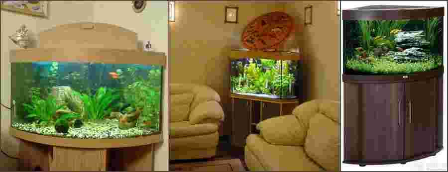 Самыми популярными остаются конструкции квадратной и прямоугольной формы, которые можно назвать универсальными. Они пригодны практически для любого интерьера. Их размеры бывают самыми разнообразными. Сделать аквариум с определенными габаритами можно на заказ. Довольно удобными являются треугольные водоемы, которые предназначены для установки в угол.