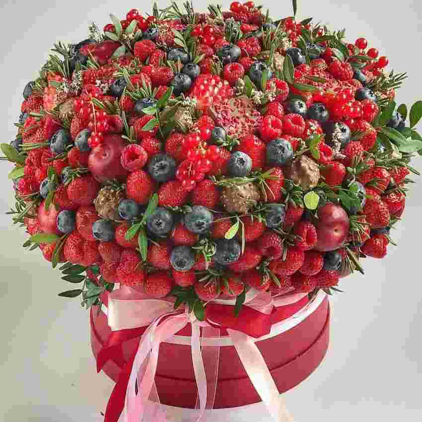 Съедобная композиция вызывает восторг и улыбку. Она составляется с использованием фруктов, ягод и листьев. Для такого букета подойдут цитрусовые, бананы, виноград и другие фрукты.