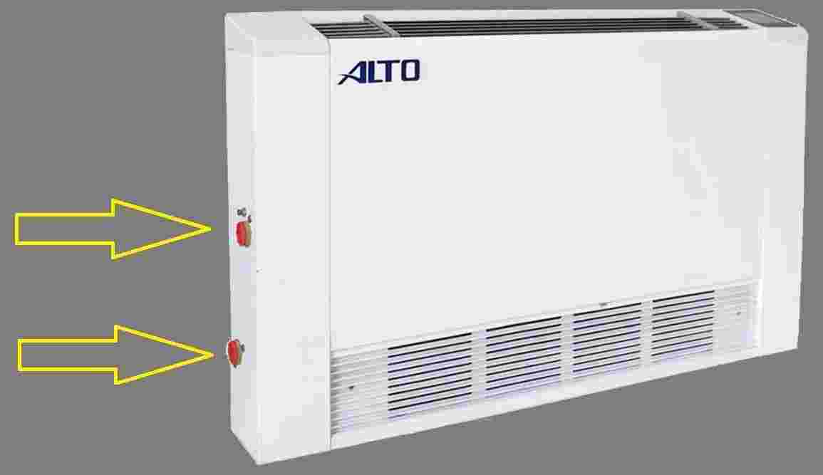 Все зависит от конкретной модели. У напольно-потолочных фанкойлов трубки обычно подключаются с боковой стороны (см. фото), у потолочный – с задней. У кассетных фанкойлов – во внутренней части, которую обычно прячут в подвесных потолках.