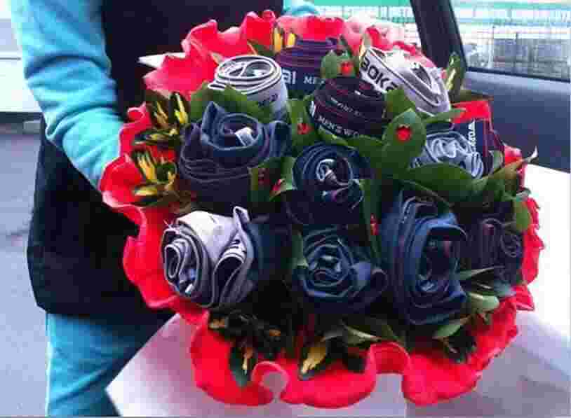 - Букет из трусов. Здесь придется потренироваться, так как каждое изделие нужно скрутить в настоящий бутон. В качестве упаковки желательно выбрать ту самую сетку, которой украшаются живые цветы. И главное — правильный букет только тот, где количество трусов нечетное.