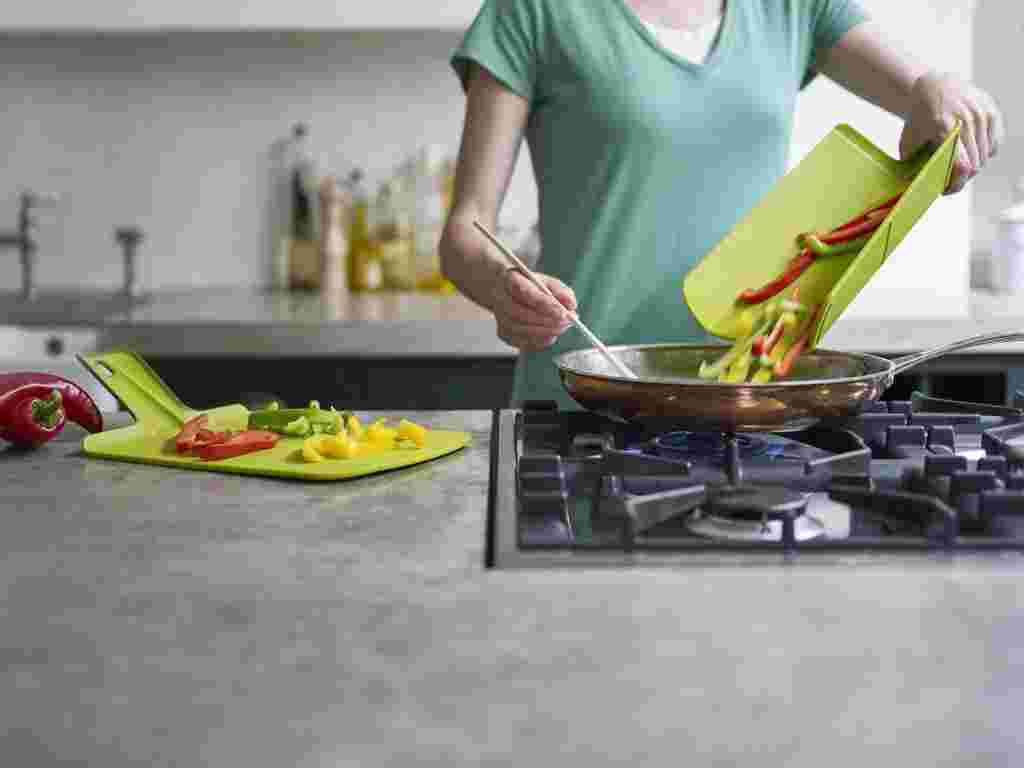 - Интересное решение дизайнеров — доска трансформер. Она складывается по сгибам, позволяя аккуратно ссыпать нарезанный продукт.