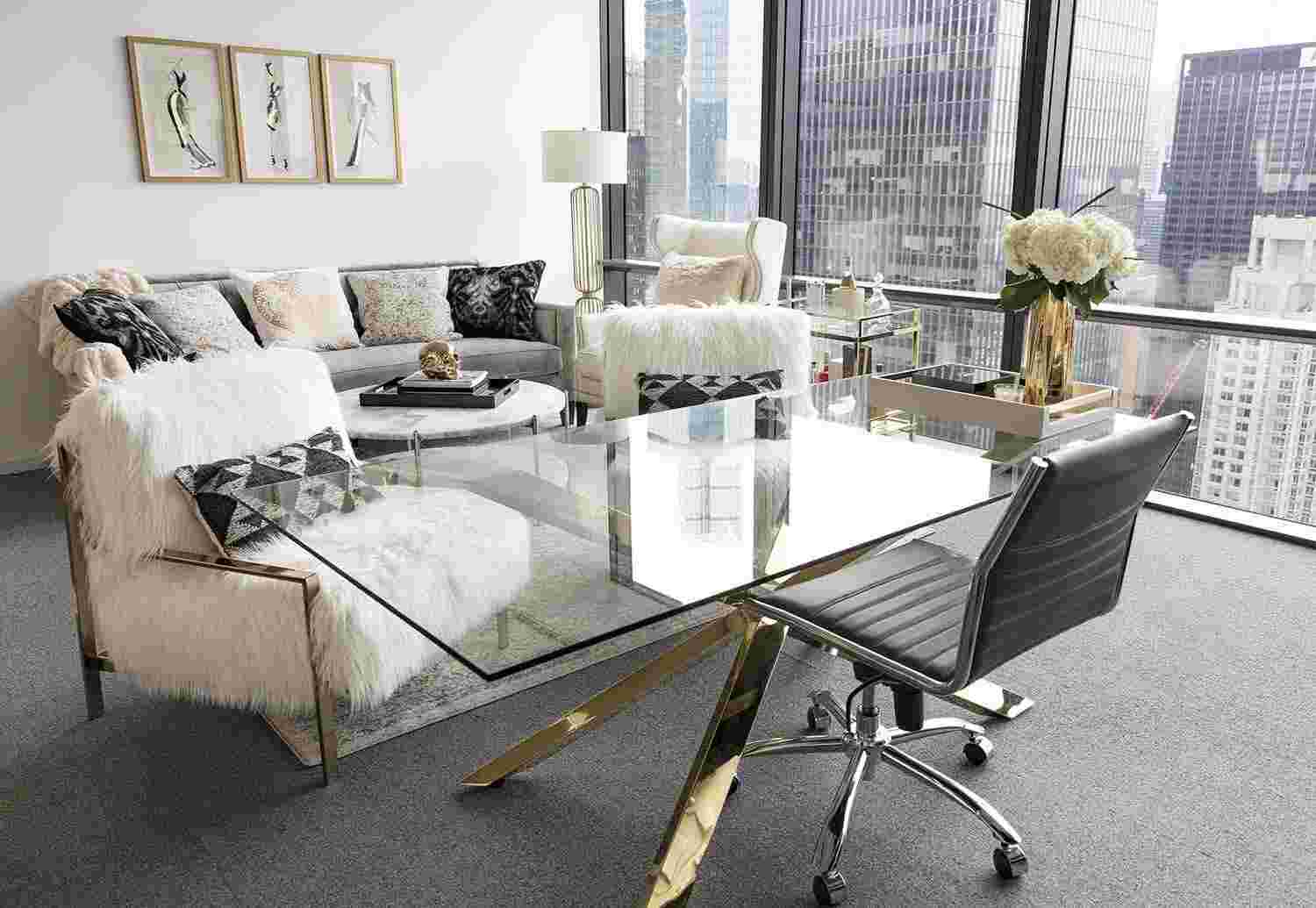 Стеклянные предметы в виде столов и шкафов делают убранство легким и невесомым. Но не следует увлекаться: разбавьте интерьер более приземленными элементами. Отлично смотрится стекло в тандеме со сталью и металлом. К примеру, за таким столом, как на фото ниже, обсудить новый или уже готовый контракт вместе с единомышленниками – одно удовольствие.