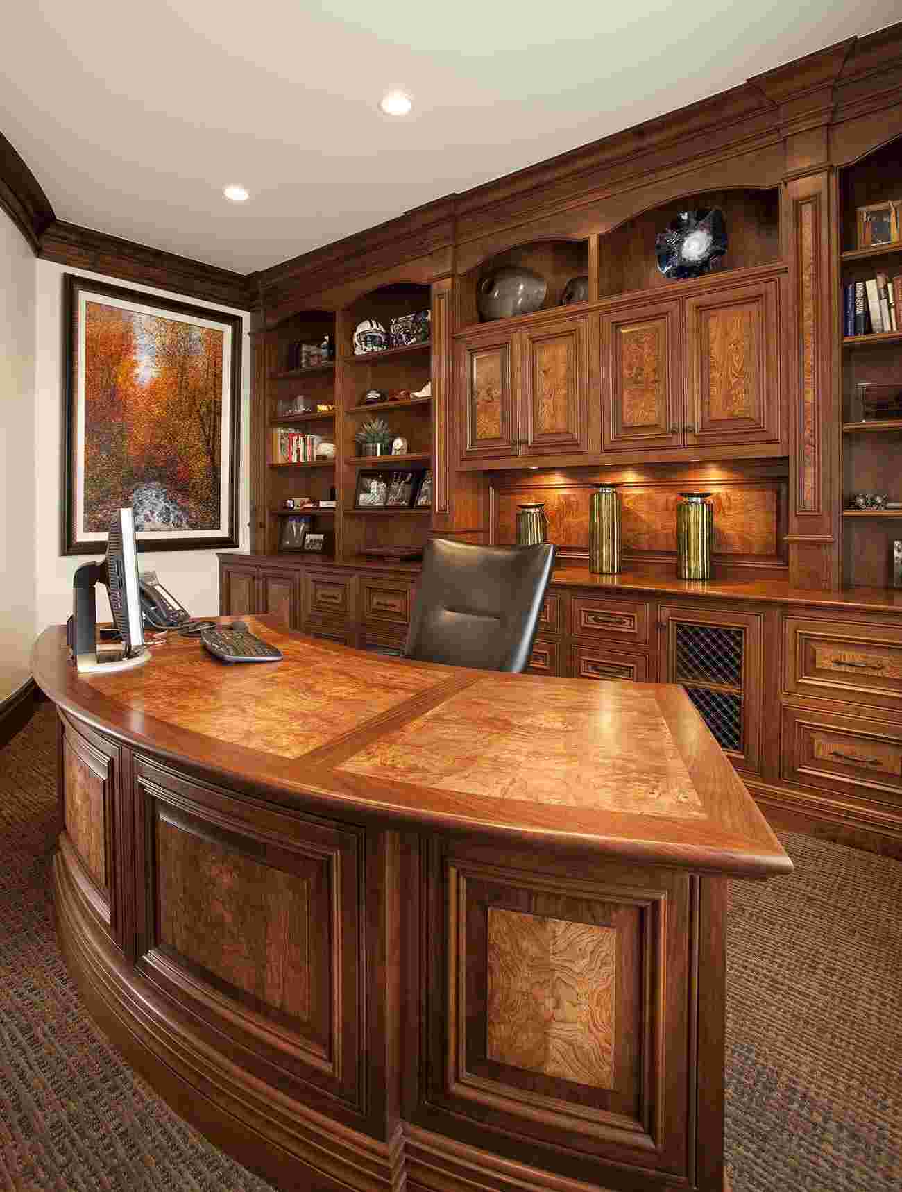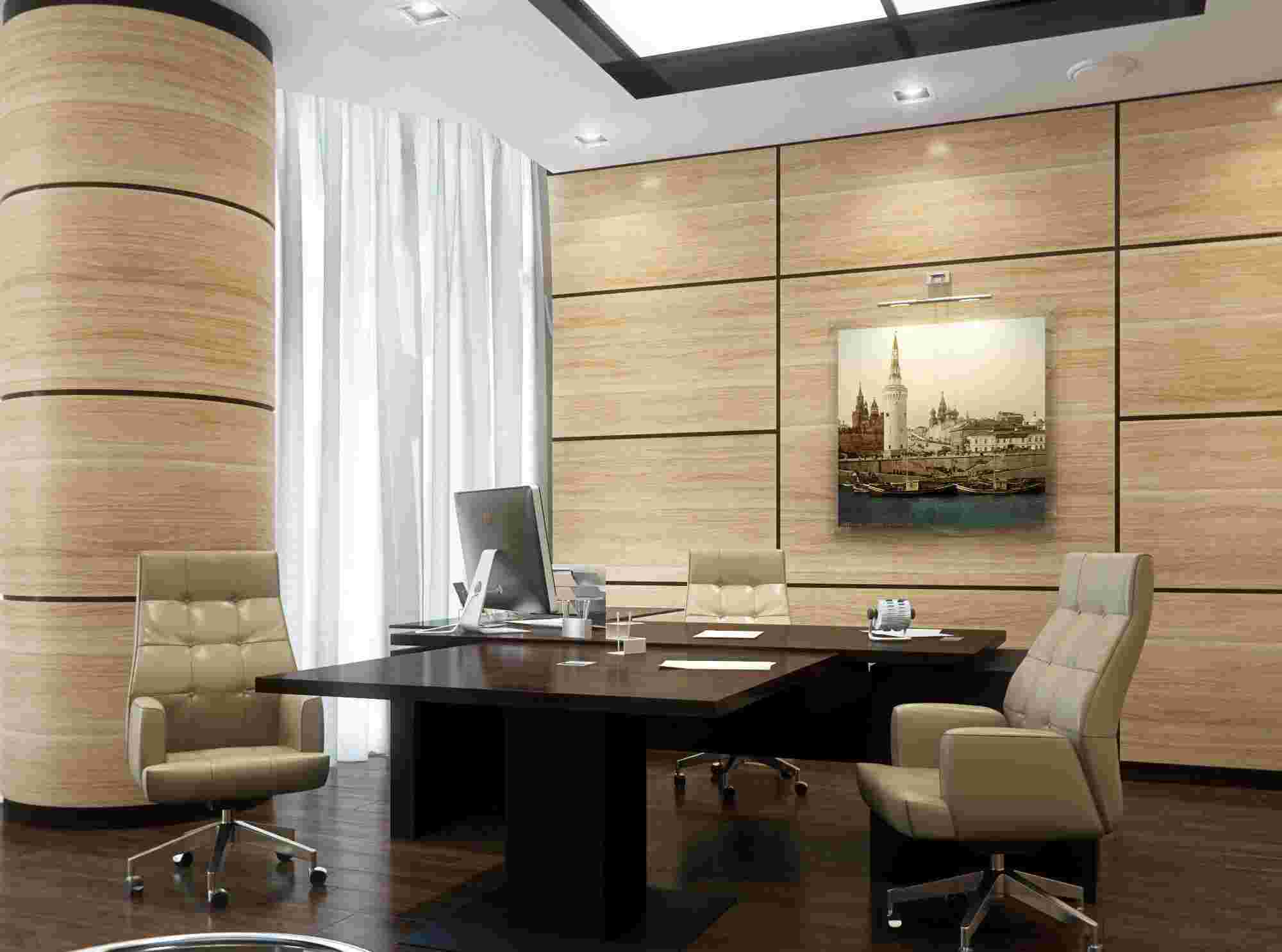 Массив дерева подчеркивает высокий статус, консерватизм и богатство лидера. Главной фигурой в меблировке является письменный стол, который выполняется нарочито громоздким и символизирует стабильность и прочное положение на рынке и в обществе. Мебель под дерево создает нотку природности и гармоничности. На постсоветском пространстве такая обстановка традиционна. Кто-то может оформить все четыре стены комнаты деревом. Однако не каждому человеку такое обилие по вкусу.