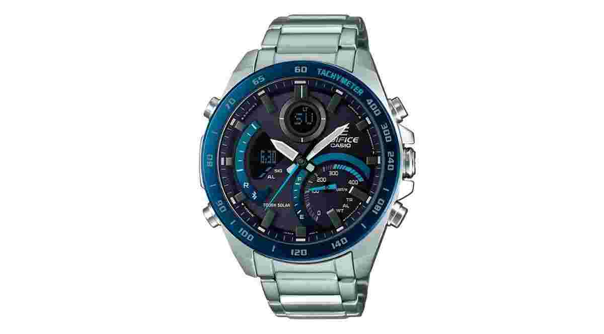 Корпус и браслет выполнен из нержавеющей стали, а монохромный дисплей защищен минеральным стеклом с подсветкой. Из умных функций здесь есть Bluetooth для прослушивания музыки, солнечная батарея и мощный процессор. Цена в российских магазинах на модель CASIO ECB-900DB-1B начинается от 11 000 руб.