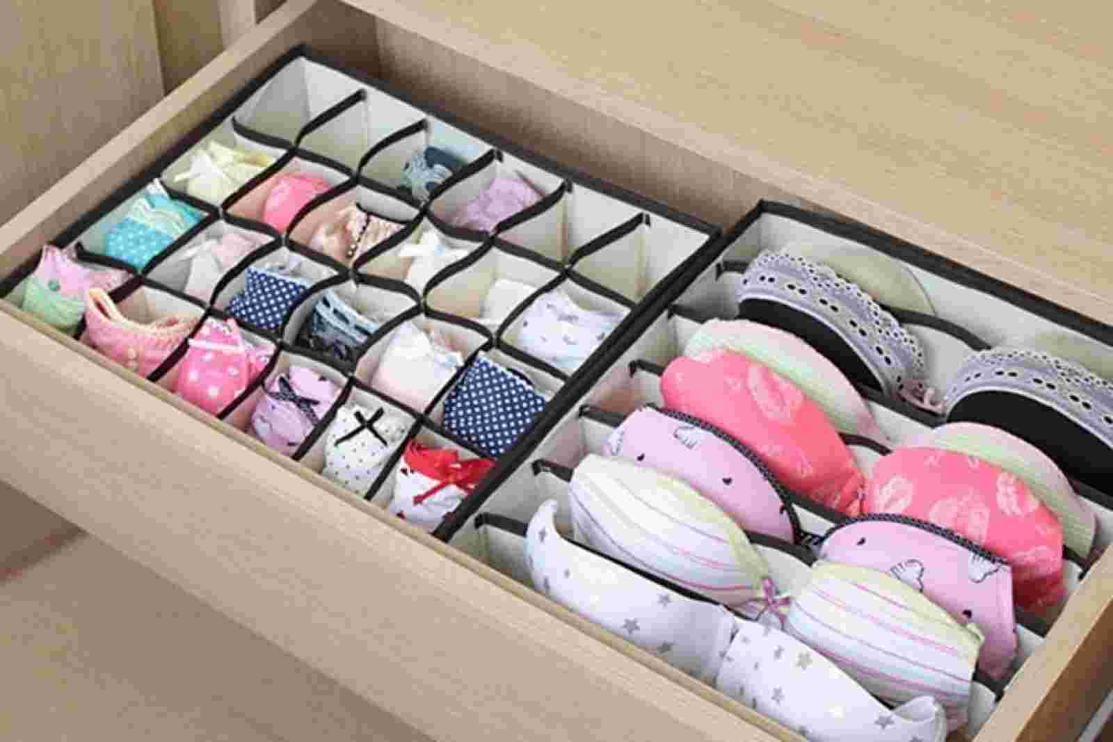 Чтобы мелкие вещи не терлись в шкафу, их лучше хранить в отдельных коробках или ящиках. Органайзер для носков и трусов — удобное приспособление для белья. С его помощью можно упорядочить всю «мелочевку» и распределить по цветам, чтобы удобнее было искать нужную вещь.