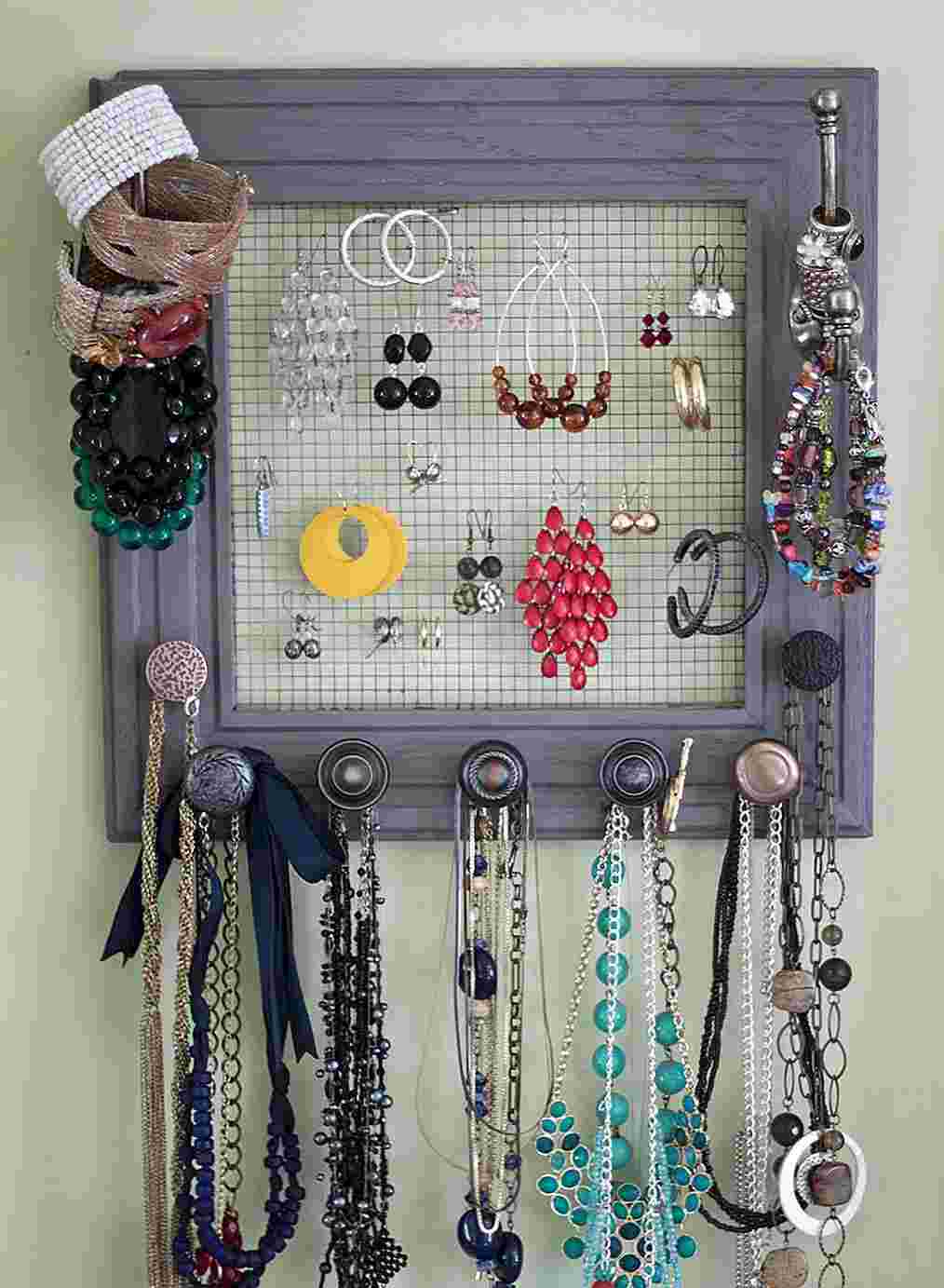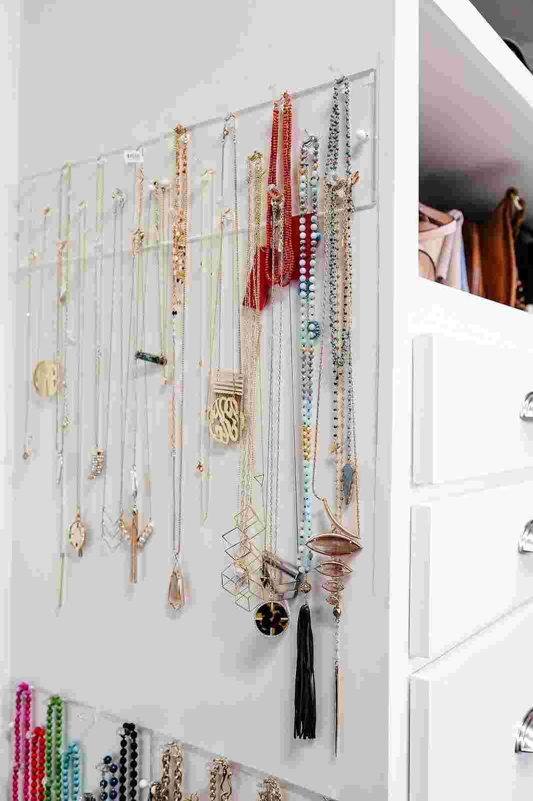 - Дверца шкафа. Будет удобна при небольшом количестве украшений, для которого нецелесообразно выделять целый ящик. На дверь можно прикрепить специальные держатели, крючки или органайзер с прозрачными карманами.