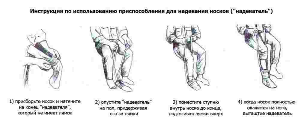 - Для эффективной эксплуатации нужно взять приспособление со скошенным углом, смотрящим на одевающего. Поместив носок внутрь трубы, натянуть резинку изделия на ее край. Опускаем на пол и пользуемся.