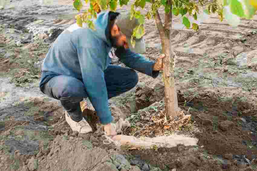Лунка должна быть не глубокая и достаточно широкая. Сделайте ее шире примерно в три раза диаметра корней. Большой диаметр очень важен, так как корни прорастают в окружающую почву и дерево постепенно укрепляться.