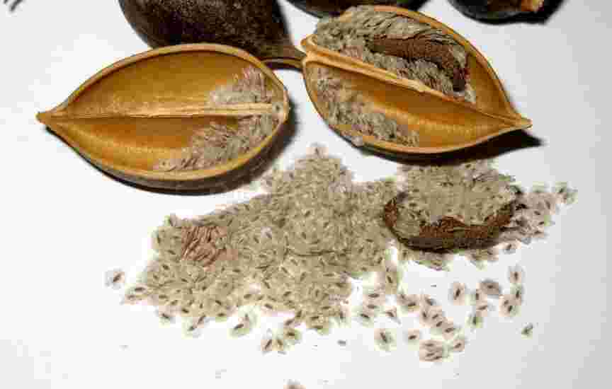 Итак, вы нашли семена павловнии, купили готовые или насобирали у «знакомого» дерева. Полностью готовые семена собраны в своеобразные коробочки тёмного цвета. Вскрыв такую коробочку, вы обнаружите внутри огромное количество мелких семян (1-2 тысячи).
