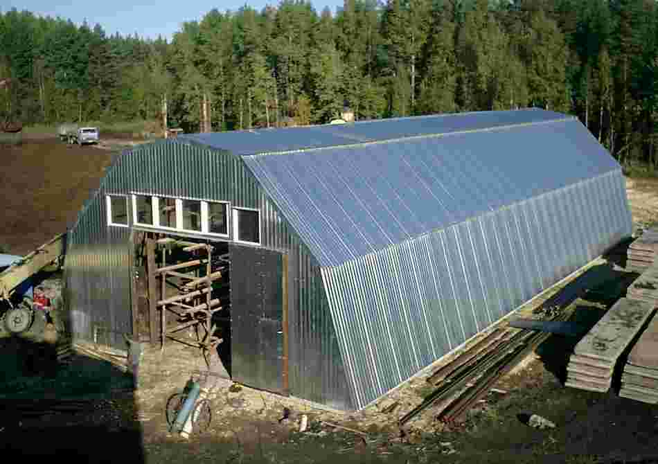 - арочный склад – наиболее прост в монтаже, не требует установки массивного фундамента и какого-либо металлического каркаса: вся несущая нагрузка приходится на арочные пролёты, которые собираются непосредственно на месте стройки из металлопрофиля;