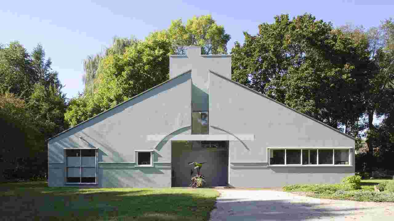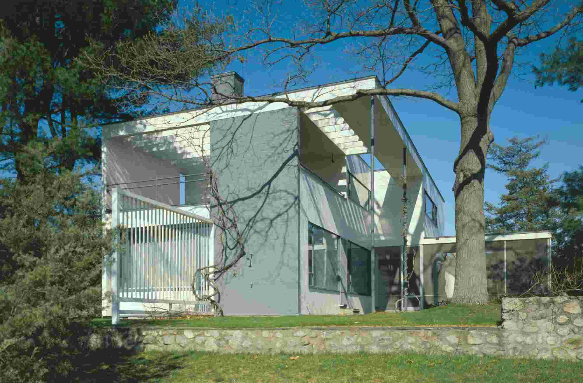 Здание имеет строгую прямоугольную форму и плоскую крышу. Длинные ленточные окна выделяются на фоне белой деревянной обшивки. Фундамент сделан из природного камня. Единственными украшениями экстерьера служат крыльцо со стеной из стеклянных блоков и металлическая винтовая лестница — отдельный вход в комнату дочери архитектора.