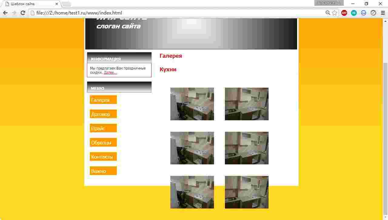 <h3>Информация</h3> <p>Мы предлагаем Вам праздничные скидки. <a href="http://test1.ru/news.php">Далее...</a></p><br /> <h3>Меню</h3>
