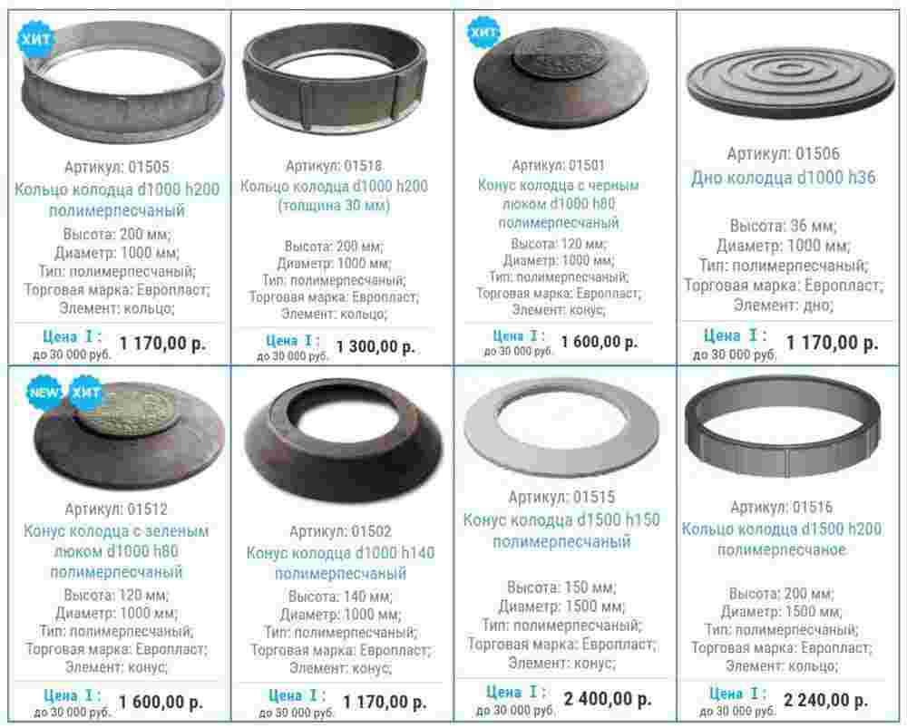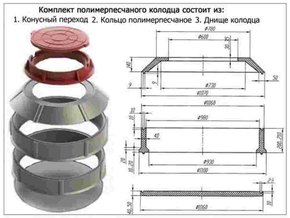 Наиболее ходовые внутренние диаметры стенового полимерпесчаного элемента канализации – 750, 1000 и 1500 мм, его стандартная высота 200 мм, реже встречаются более высокие кольца в 250 мм. Сборные колодцы комплектуются дном толщиной до 50 мм и конусообразными верхними плитами высотой от 80 до 150 мм, имеющими центральный круглый люк, закрывающийся полимерной крышкой.