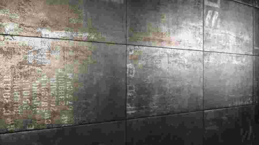 Яркая новинка этого сезона — широкоформатный кафель под металл. Самые актуальные модели: серебро, алюминий, золото, сталь.