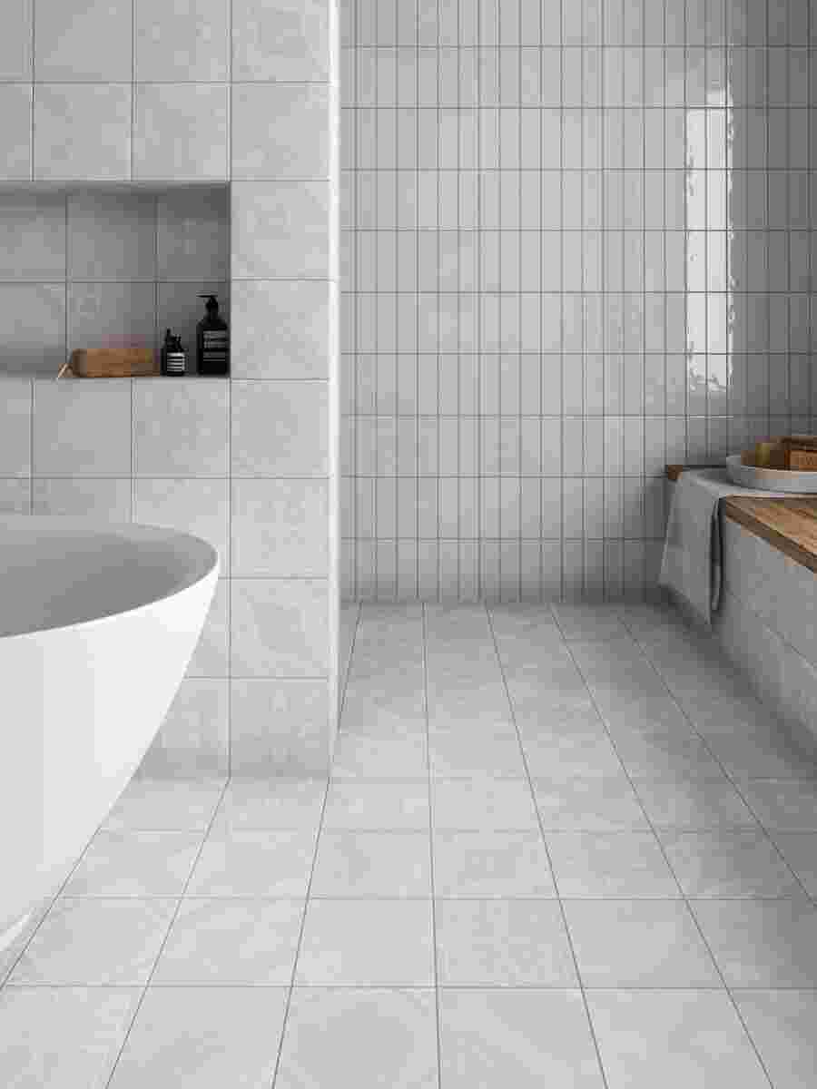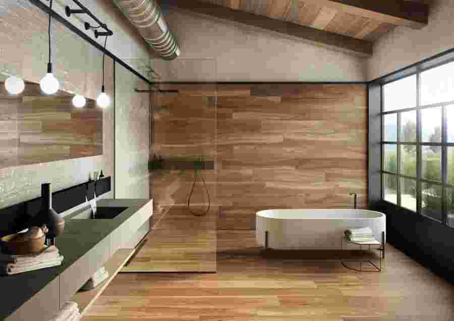 Для создания такой образа используются крупные плиты на полу и стенах или кафель под дерево, приглушенных оттенков белого, серого, бежевого. Завоевали популярность варианты с расцветкой под бетон.