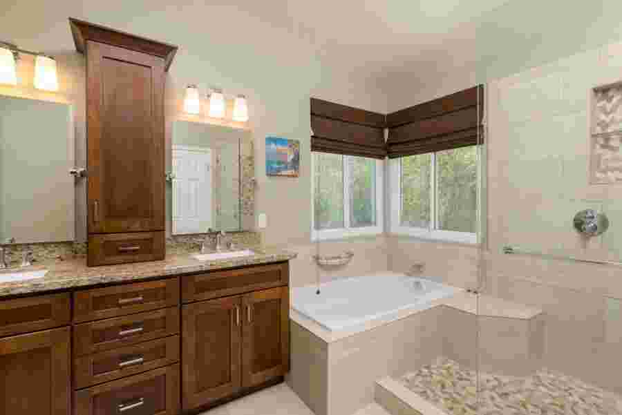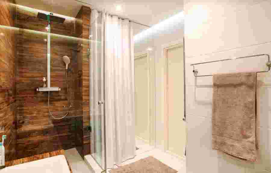 - Сегодня можно использовать аксессуары «под дерево» или под натуральный камень. Стоить заметить, что белая плитка в ванной комнате может помочь вам визуально расширить или, наоборот, сузить пространство. Для этого две стены нужно сделать светлыми, а две – тёмными. Таким образом, узкая ванная комната будет казаться немного шире.