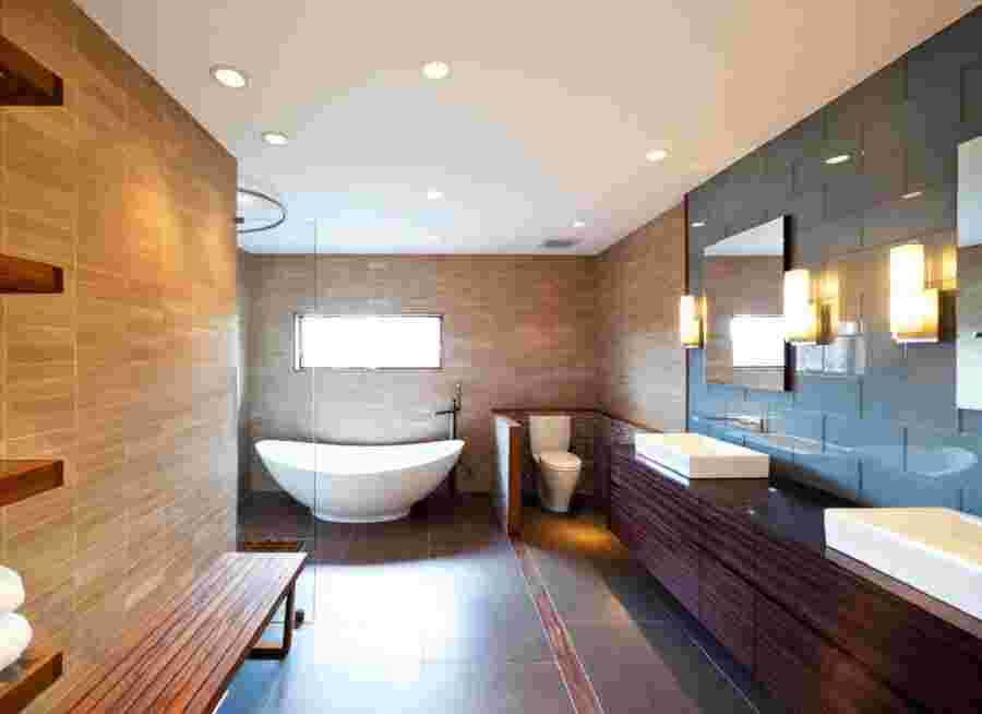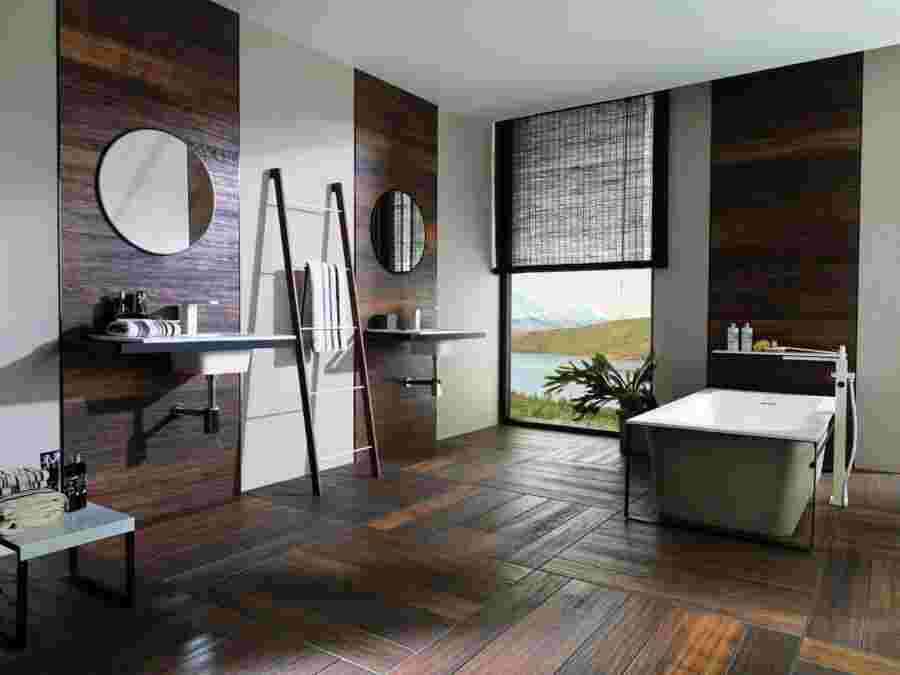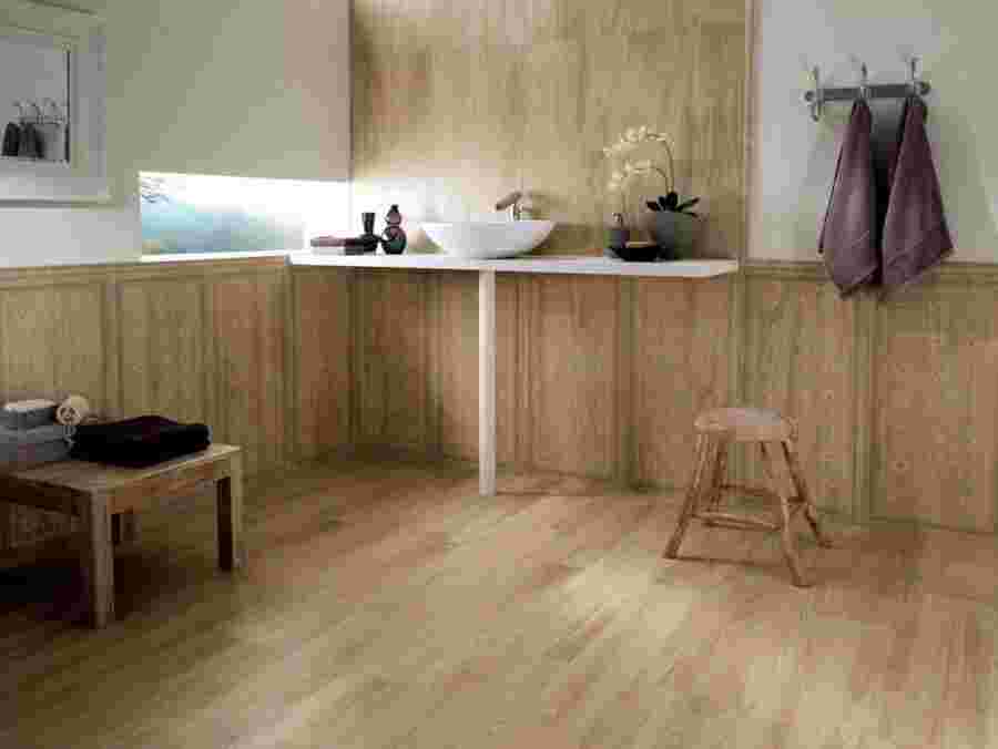 В санузле кафель под дерево используется не только как напольное покрытие. Им декорируют отдельные элементы, выделяют рабочие поверхности. В моду вошел стиль сауны. Когда покрытием под дерево покрывают все поверхности. С декором в виде живых растений, натуральных камней и бамбука такая комната смотрится очень органичной, теплой и уютной.