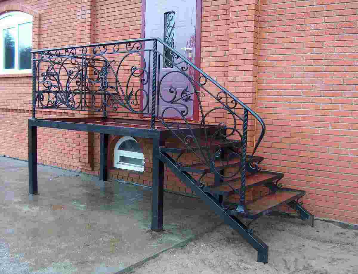 Очень красиво смотрится металлическое крыльцо. Благо, возможностей оформить его достаточно много. Элегантно выглядят конструкции у входа в дом с коваными поручнями, с ажурными широкими проступями.
