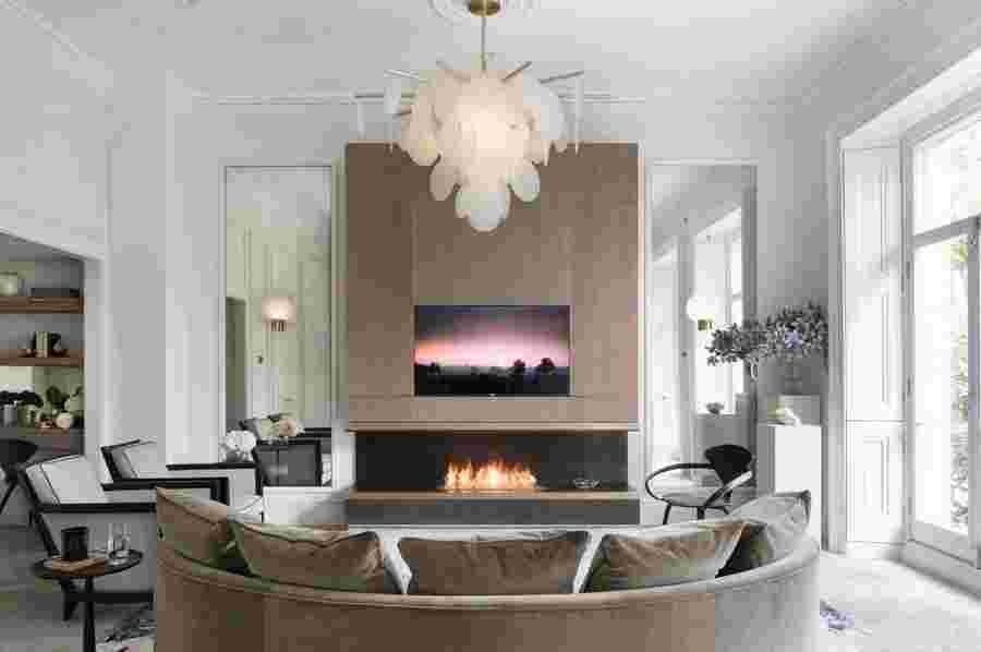 Дизайнерская ассиметричная люстра в большой гостиной с высоким потолком