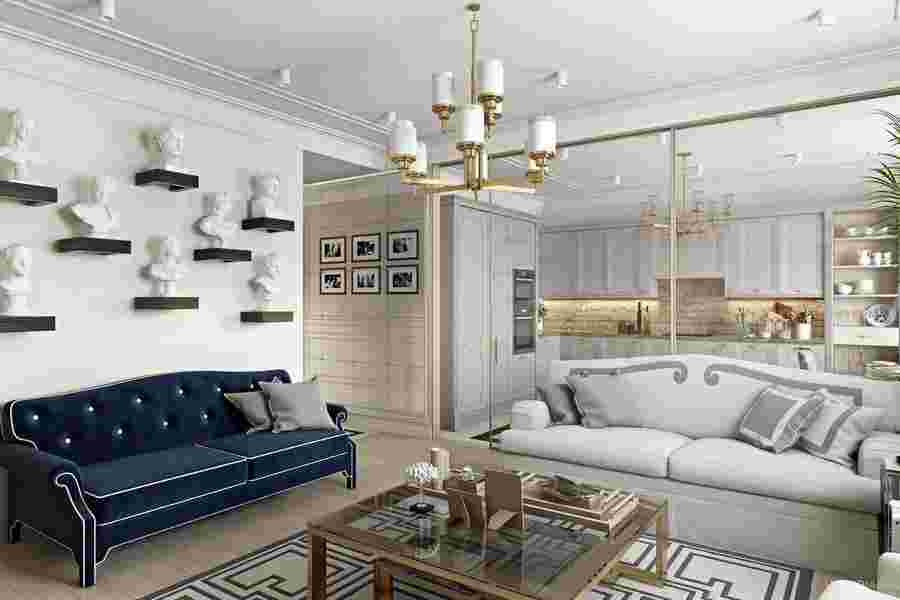 - В зал требуется люстра с ярким и тёплым светом, чтобы помещение наполнялось уютом. Для высоких потолков допустима торжественная подвесная люстра, в классическом интерьере она может быть хрустальной. Стандартный по размерам и форме зал чаще всего украшают потолочным светильником с плафонами (не более 6 штук). Если требуется гармоничное освещение для вытянутого помещения, купите маленькие потолочные приборы и симметрично расположите их наверху. Во всех случаях не забывайте про возможность регулировать освещение с помощью диммера.