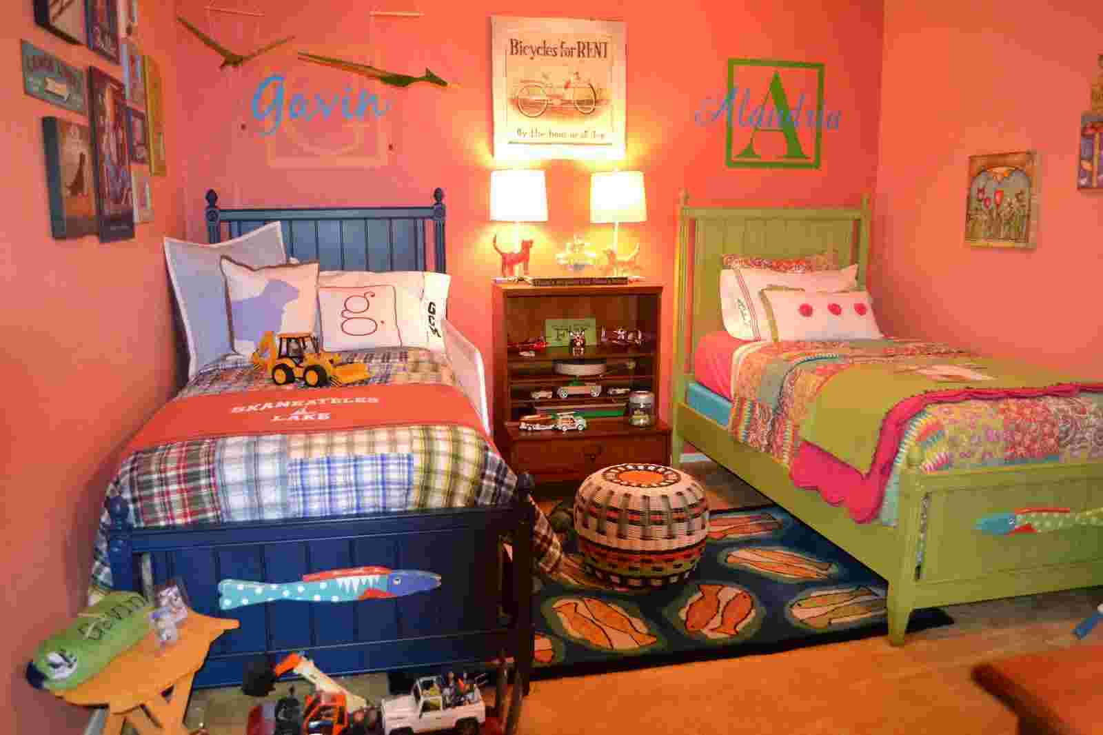 Если размеры помещения позволяют, нужно разделить части девочки и мальчика с помощью перегородок, мебели или занавески
