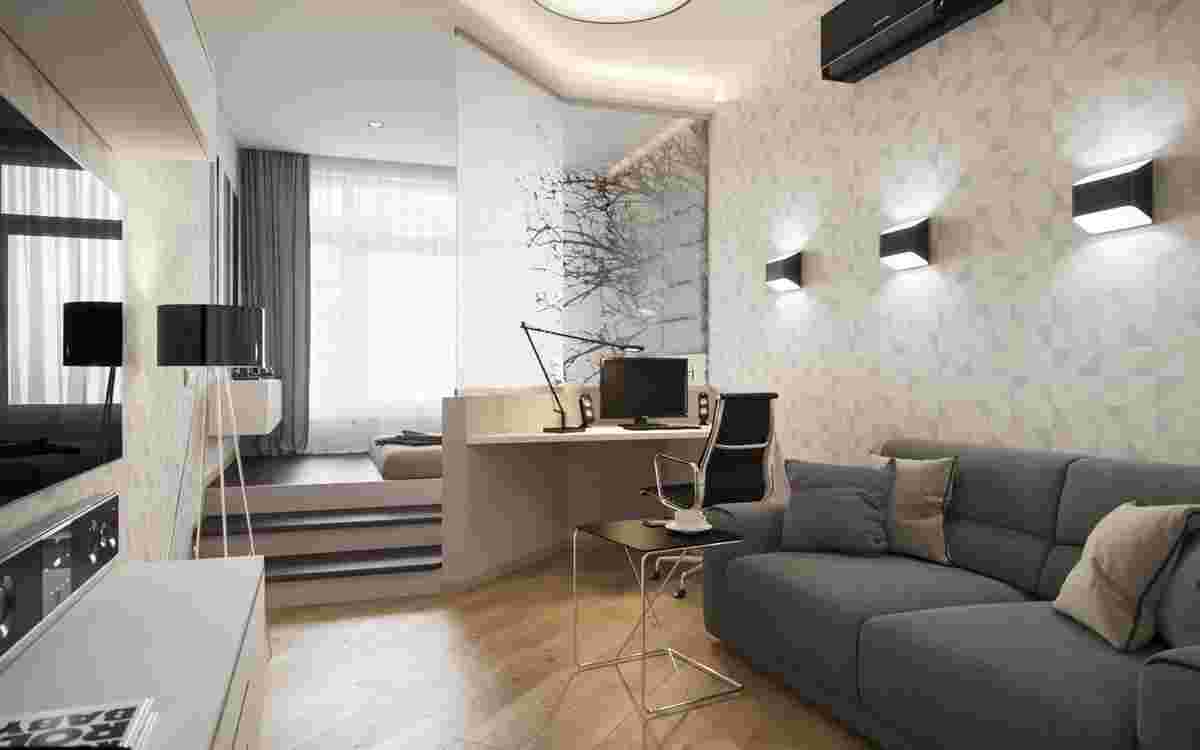 Для этого нужно обратить внимание на некоторые дизайнерские уловки, как пример — зонирование. Зонируя однокомнатную квартиру, нужно отдать предпочтение светлым тонам, встроенным в потолок светильникам и зеркалам (они зрительно увеличивают площадь квартиры)