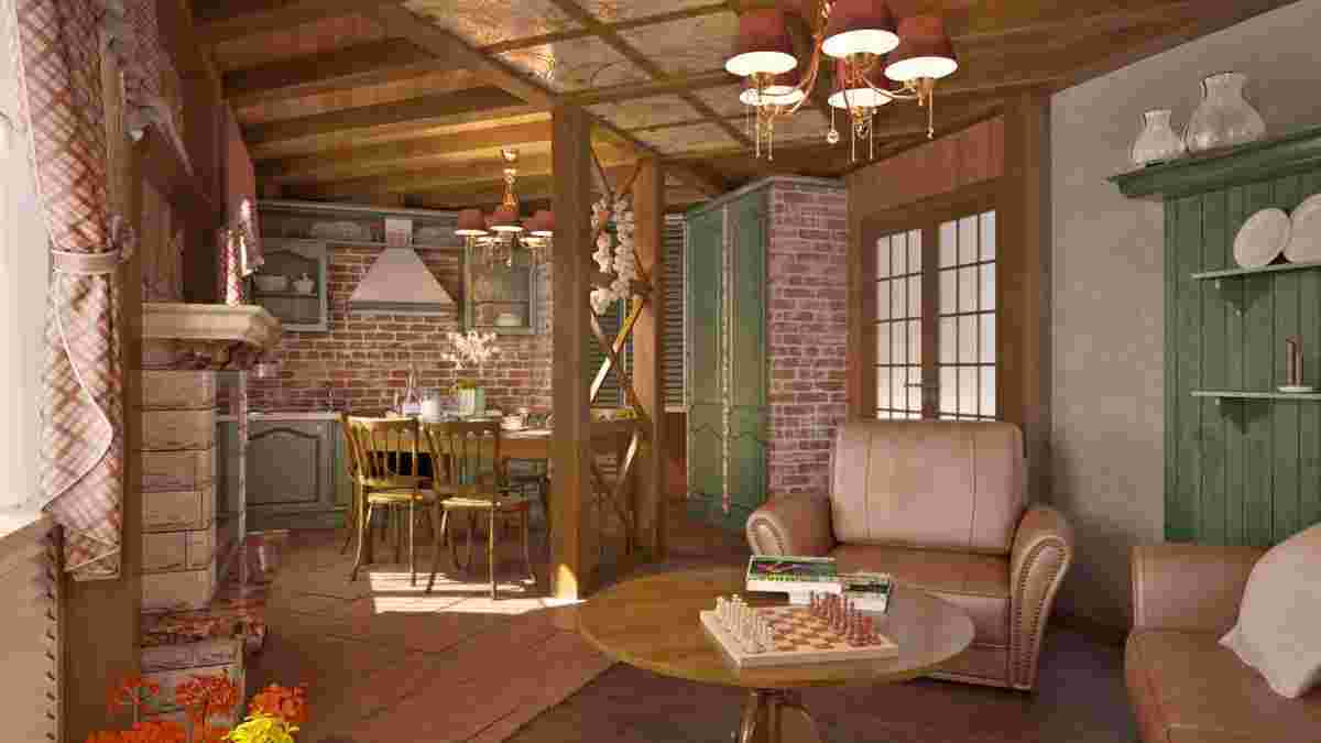 В дачном домике можно перегородку сделать в тон балок на потолке. Этот интересный прием часто используют дизайнеры.