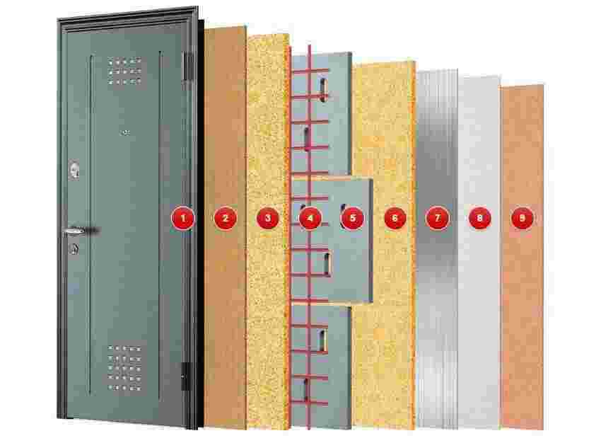 Конструкция входной двери Super Omega 10 фирмы Торекс: 1 — сталь 1,5 мм, 2 — шумоизоляция, 3 — вспененный полиуретан, 4 — арматура 10 мм, 5 — «пенобетон», 6 — вспененный полиуретан, 7 — сталь 1 мм, 8 — теплоизоляция 3 мм, 9 — декоративная панель
