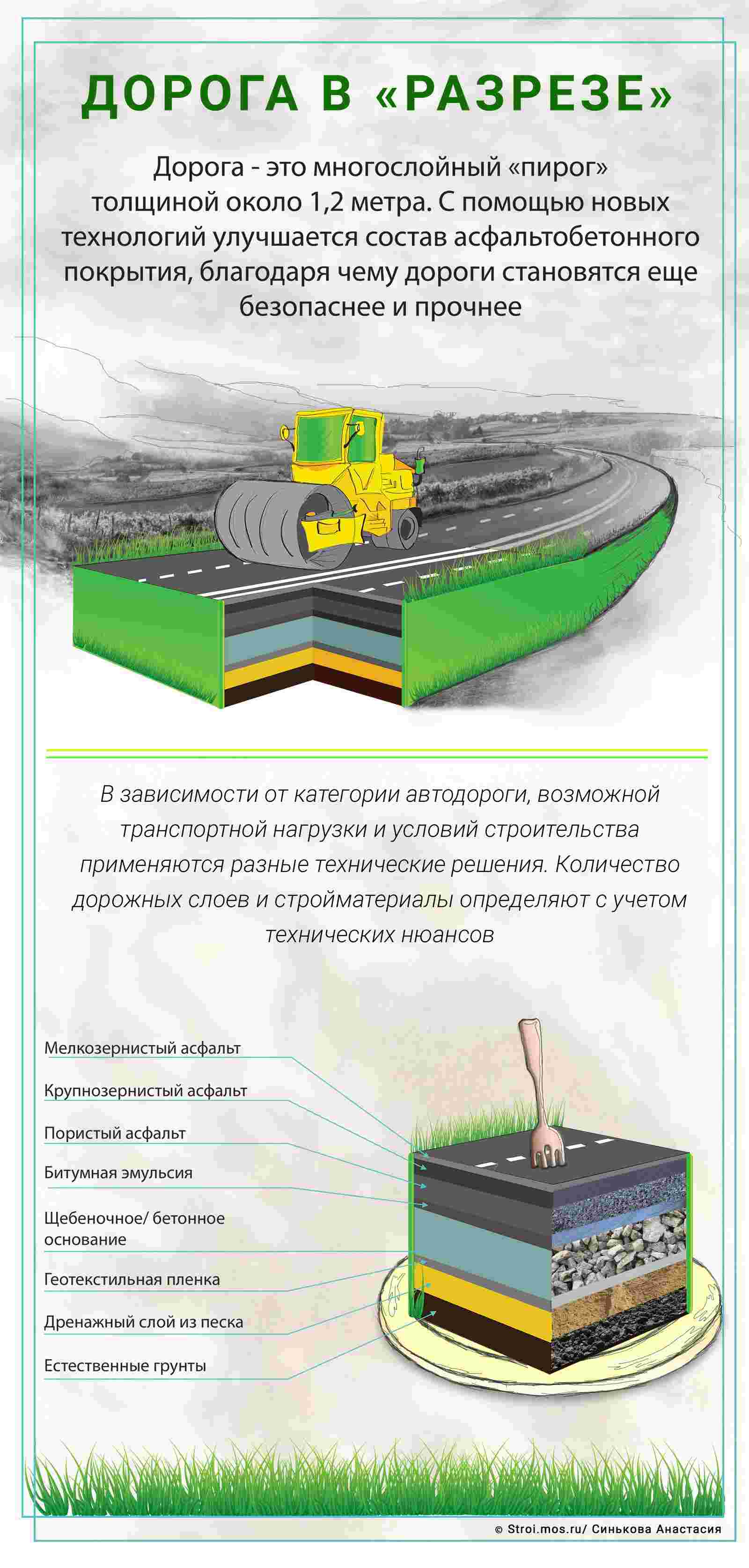 Самым распространенным строительным материалом является асфальтобетон. Асфальтобетон — это смешанные вместе щебень, песок, каменная мука и собственно расплавленный асфальт. Эту «начинку» выкладывают на земляное основание в несколько слоев. Кстати, именно из-за многослойности дорожного полотна его зачастую называют «дорожный пирог». Количество слоев зависит от различных факторов, но прежде всего — от предполагаемой транспортной нагрузки.